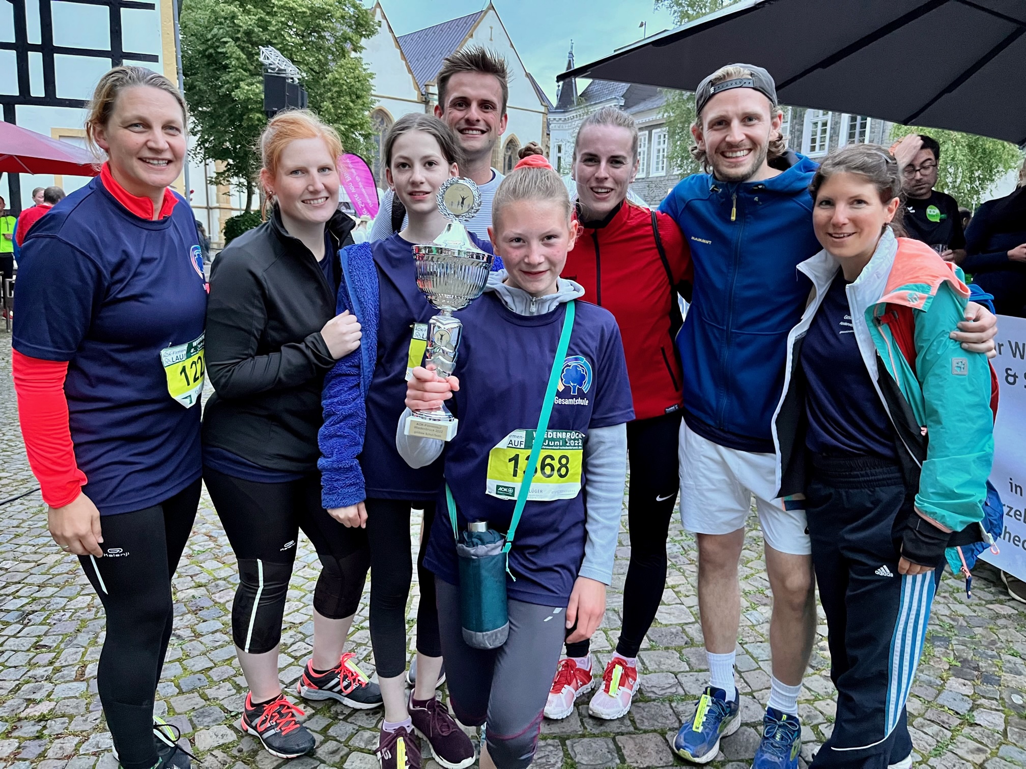 Auch die Fürstin Marissa zu Bentheim Tecklenburg weilte unter den Zuschauern. Zeitweiliger Regen tat der guten Stimmung entlang der Strecke, die über den Mühlen- und Nordwall, um den Emssee und über den Markt führte, keinen Abbruch. Die Karnevalsgesellschaft “KG Helü” hatte einen Stimmungspunkt an der Kirche aufgebaut und versetzte nicht nur ihre eigene Mannschaft, die “Red-Rose-Runners”, in gute Laune, sondern auch alle anderen Firmenläufer. Die grösste Frauengruppe stellte mit 58 Teilnehmerinnen ebenfalls die Kreisverwaltung. Den Pokal für die größte Schule heimste die Moritz-Fontane-Gesamtschule (104 Teilnehmer) ein. Das drittgrößte Team hinter Kreis (72) und Tönnies (53) stellte der Wertkreis Gütersloh.